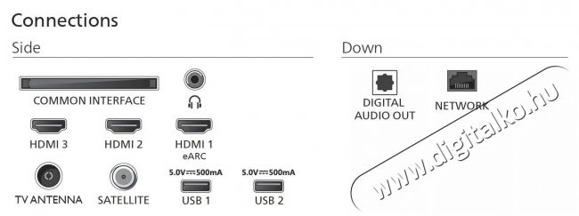 CI+, Digitális optikai/digitális hangkimenet, HDMI 2.0, USB |