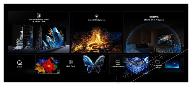 TCL-technológiák (AV/TV) AiPQ Processor, Bluetooth, Chromecast Built-In, Dolby Atmos®, Dolby Vision™, Google TV, HDMI ARC, HDMI eARC, HDR (High Dynamic Range), Onkyo Sound, T-cast