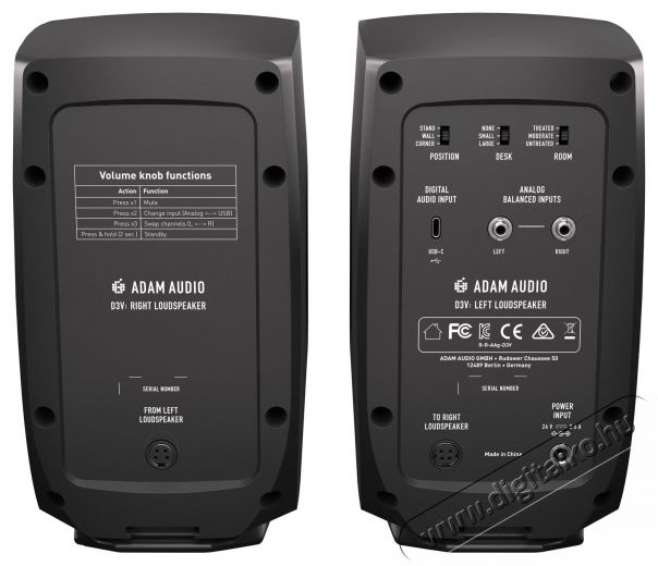 A D3V USB-C bemenettel rendelkezik, ami azt jelenti, hogy a monitorrendszer a számítógéphez csatlakoztatva digitális kimeneti eszközként működik, így nincs szükség további audio interfészre a lejátszáshoz. A plug-and-play funkció mobil eszközökre is kiterjeszthető, így kiváló minőségű hallgatást tesz lehetővé tömörítés és konverzió nélkül, amelyek gyakran kísérik az ilyen típusú kapcsolatokat. Ezenkívül a D3V kiegyensúlyozott TRS¼ bemenetekkel rendelkezik a hagyományos analóg alkalmazásokhoz.