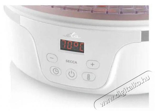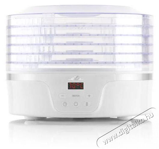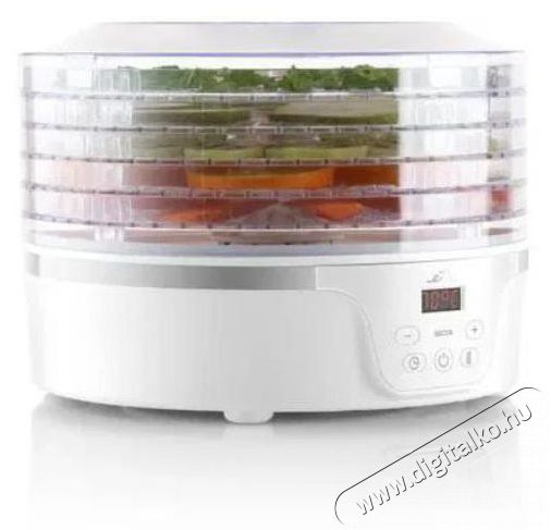 Aszalógép zöldség és gyümölcs szárításához - 380 W teljesítmény segítségével szárítható gomba, fűszernövények, tea, virágok, 5 szárítólemez, szárítólemez átmérője 28,8 cm, kézi vezérlés, időzítő, hőmérséklet szabályozás 35 - 70 °C, átlátszó fedél, túlmelegedés elleni védelem, kijelző, műanyag szárítólemezek, aszalógép anyaga műanyag, mérete 23 × 29,5 × 29,5 cm (Ma×Sz×Mé).