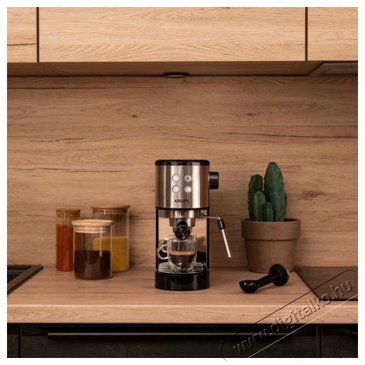Minden a kávé elkészítéséhezA KRUPS XP441810 karos kávéfőzőhöz egy praktikus mérőpohár tartozik, így mindig a tökéletes mennyiségben adagolhatod ki a kávét. A tökéletes csésze elkészítéséhez használd a tampert a kávé tömörítéséhez és igazításához.