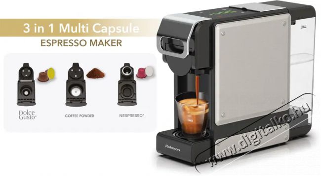 Rohnson R-98044 3in1 Ez a praktikus Rohnson kapszulás kávéfőzőgép hű társad lesz az álmos reggeleken. Üzemeltetése bárki számára gyerekjáték lesz, egy gombnyomás múlva már élvezhető is a frissítő italt. A legjobb kávékülönlegességeket tudja elkészíteni, a készülékkel főzött isteni espresso nagyszerű ízével nyűgöz le. Dolce Gusto és Nespresso Original kapszulákkal kompatibilis.