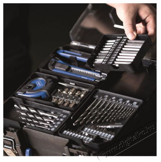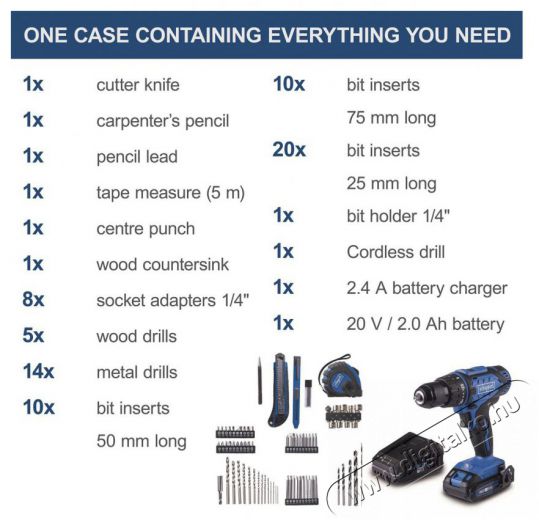 - A praktikus készlet tartalmaz fúró-csavarozót, akkumulátort, töltőt és 74 darab tartozékot