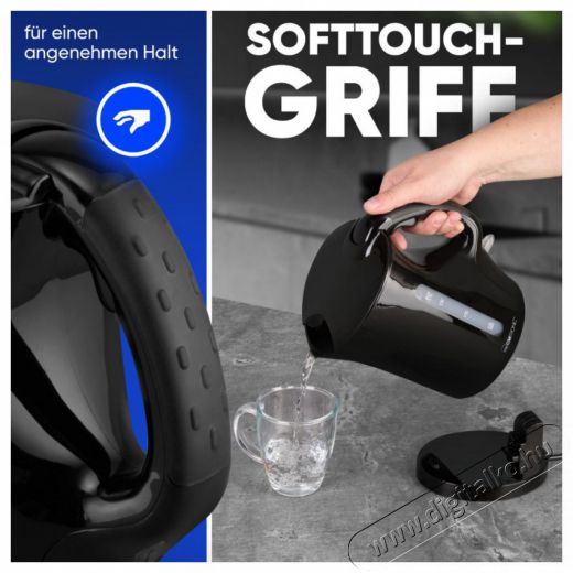 Ez a modern vízforraló számos funkciót kínál, és meggyőző egyszerű használatával és biztonságával Akár 1,7 literes űrtartalmával ideális mindennapi használatra. Az akkumulátoros technológiának köszönhetően a be- és kiöntés különösen egyszerű és kényelmes.