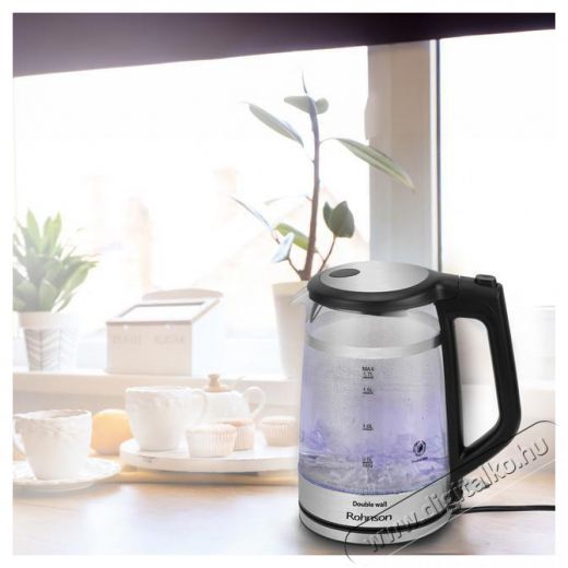 Rohnson R-7645 Double Wall Ezen 1,7 lűrtartalmú Rohnson Vízforraló biztosítja kedvenc forró italunk gyors és egyszerű elkészítését. A vízforraló üvegből készült., nem tartalmaz semmilyen egészségre ártalmas anyagot, és nem hajlamos szagok vagy ízek felszívására. Gond nélkül ellenáll a karcolódásnak, illetve hőmérséklet- és vegyszerállósággal is rendelkezik. Kihajtható szűrő fogja fel ügyesen a szennyeződéseket és az esetleges vízkövet. Duplafalú kialakítást kapott, ami megakadályozza, hogy a felülete túl magas hőmérsékletet érjen el, ezért nem kell aggódnunk, hogy megéget bennünket. A fokozott biztonságért olyan berendezés felel, mint automatikus kikapcsolás kevés víz esetén, illetve a forrás elérésekor. A fűtőspirál az alja alatt van elrejtve, így védve van a vízkő felhalmozódásától.