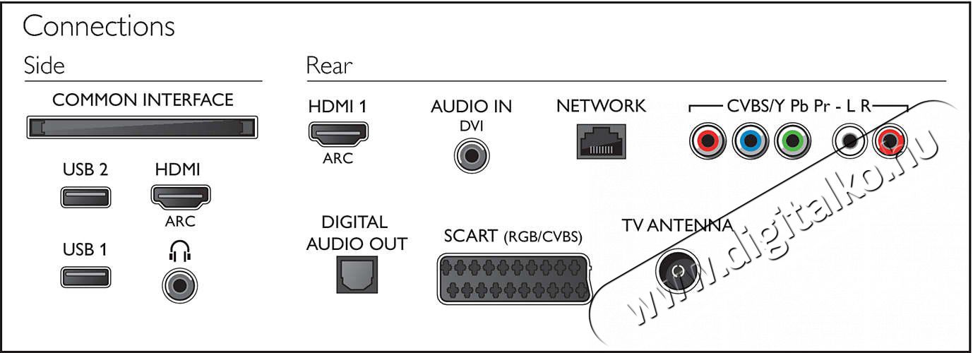 - Egyéb csatlakozások - Antenna IEC75,Általános interfész plusz (CI+),Digitális audiokimenet (optikai),Audió L/R bemenet,Audiobemenet (DVI),Fejhallgató-kimenet,Szervizcsatlakozó
