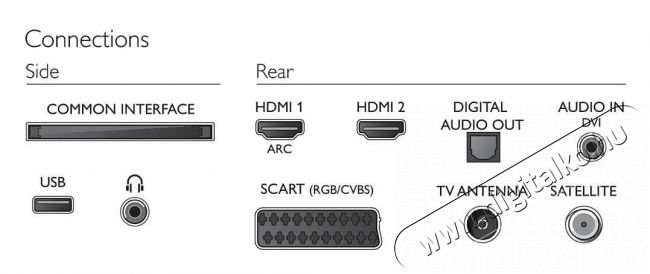 Egyéb csatlakozások | Általános interfész plusz (CI+), Digitális audiokimenet (optikai), Antenna IEC75, Műholdas csatlakozó, Audiobemenet (DVI), Fejhallgató-kimenet |