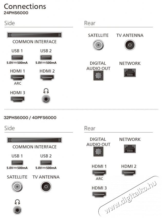 | Be- és kimenetek | CI+, Digitális optikai/digitális hangkimenet, HDMI 2.0, USB |