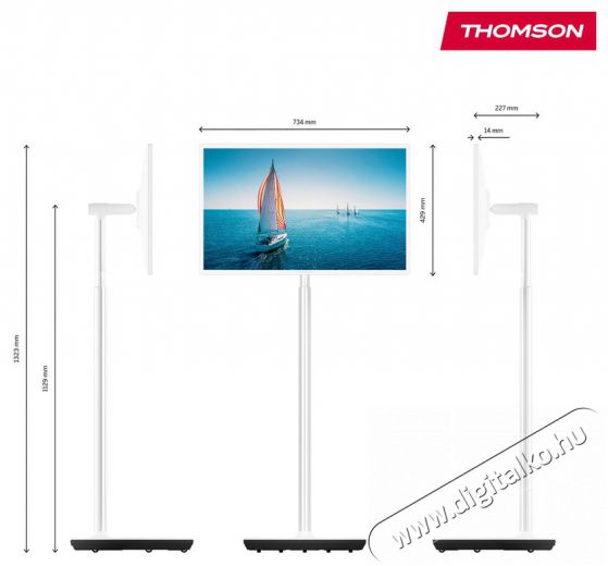 A TV elhelyezési lehetőségeinek széles választéka Miután a Thomson GO TV 32HA4M44 televíziót a megfelelő helyre helyezted, könnyen beállíthatod nemcsak az állvány magasságát, hanem a optimális látószög érdekében a tévéképernyőt is elforgathatod vagy megdöntheted. A Thomson GO TV 32HA4M44 vékony keretekkel rendelkezik, míg az összességében sikeres formatervezést a fehér színvilág emeli ki.