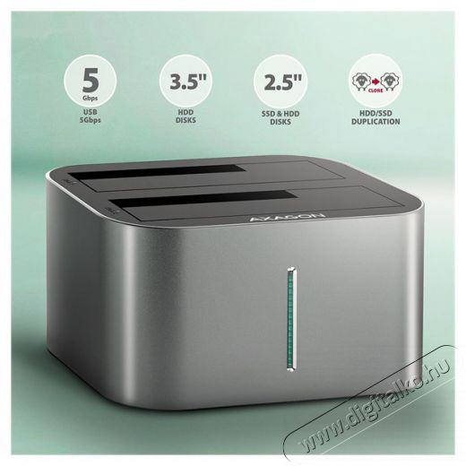 Az AXAGON ADSA-DC DUAL CLONE SuperSpeed USB-C 5Gbps dokkolóállomás gyorsan és egyszerűen csatlakoztat akárkét 2.5" vagy 3.5" lemezt a számítógéphez. A számítógéphez való csatlakozást a dokkolón található modern kétoldalas USB-C csatlakozó a mellékelt 80 cm hosszú USB-C <-> USB-A kábellel együtt teszi lehetővé.