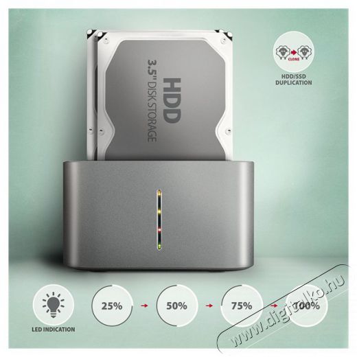 Ez a kompakt segédeszköz a legegyszerűbb módját kínálja annak, hogy akár két bármilyen 2.5"/3.5” SATA meghajtót csatlakoztasson a számítógépéhez vagy laptopjához. Egy vagy akár két lemez egyszerre csak becsúszik az alapba, nincs szükség szerszámokra vagy kiegészítőkre. Az lemezek cseréje nagyon gyors és egyszerű.