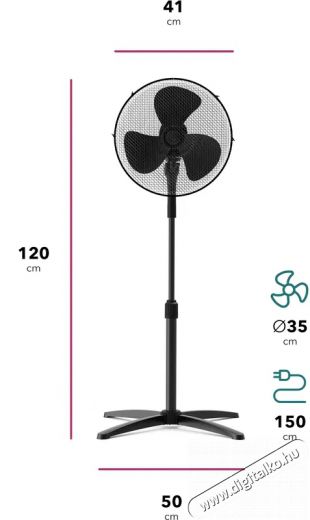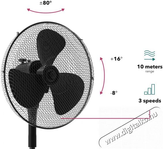 Függőleges és vízszintes oszcillálás A Home álló ventilátor 3 sebessége könnyedén szabályozható a gombbal. A függőleges oszcillálás lehetővé teszi a levegő áramlását -8° és +16° között, a vízszintes oszcillálás mértéke ±80° (az oszcillálás ki-/bekapcsolása a karral történik).