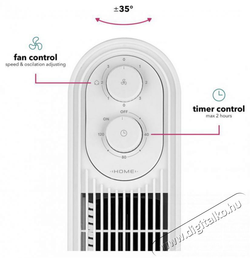 Automatikus oszcilláció és időzítőA Home FN-T600W Easy Breeze ventilátor áramlási tartománya akár 8 méter is lehet. A 70°-os automatikus vízszintes oszcilláció szintén praktikus, így a frissítő levegő hatékonyan oszlik szét a helyiségben. Emellett 3 sebességfokozatot vagy 2 órás időzítőt is használhatsz, amelynek letelte után a ventilátor automatikusan kikapcsol.