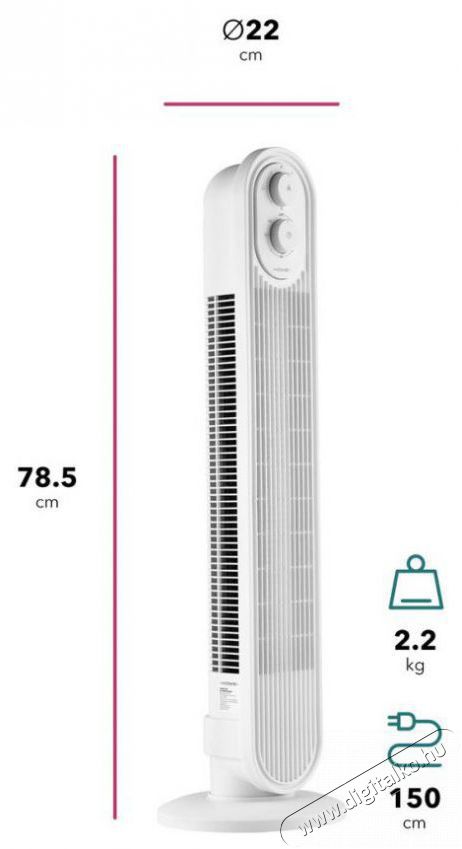 Kompakt és könnyű ventilátorTedd kellemesebbé a forró nyári napokat a Home FN-T600W Easy Breeze oszlopventilátorral, amely automatikus 70°-os vízszintes oszcillációt, 3 sebességfokozatot, időzítőt vagy egyszerű kezelést kínál. Kompakt és könnyű kialakításának köszönhetően, amely kevesebb mint 80 cm magas, könnyen szállítható, és ideális választás még kisebb helyiségekben is.