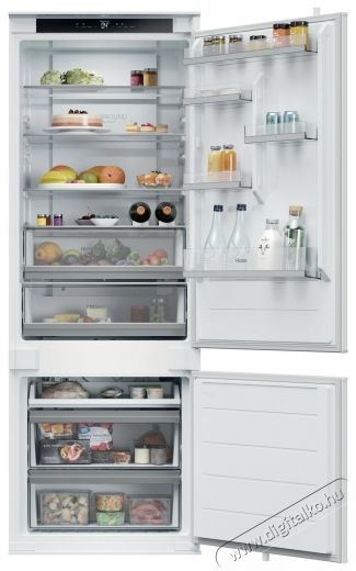 HAIER HBQW5719E ID TITANIUM 2 beépíthető hűtőA Haier HBQW5719E ID Titanium 2 beépíthető hűtő igazán bőséges teret kínál 69 cm szélességben. Az 1 935 × 690 × 550 mm-es méretek 382 l-es kapacitást rejtenek — 281 l-es hűtőtér és 101 l-es fagyasztótér — így könnyedén megbirkózik a nagy bevásárlásokkal és a családi használattal is. A Total No Frost megszabadít a leolvasztástól, az Air Surround finoman és egyenletesen osztja el a hideg levegőt, a Humidity Zone HCS technológiával pedig hosszabb ideig frissen tartja a gyümölcsöket és zöldségeket. A Wi-Fi/Bluetooth kapcsolaton és a hOn alkalmazáson keresztül távirányítást és okos asszisztenseket (Advanced Drink, Assistant, MyInventory) használhatsz. Természetesen rendelkezik Super Cool/Freeze funkcióval, csendes inverteres kompresszorral (33 dB(A)), E energiaosztállyal és megfordítható ajtóval a konyhába való könnyű beillesztéshez. Regisztráció után 20 év garanciát kapsz az inverteres kompresszorra.