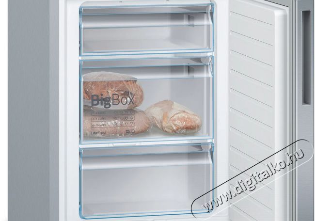 A BOSCH KGE36ALCA több helyet kínál a fagyasztott élelmiszerek számáraBOSCH KGE36ALCA kombinált hűtőszekrény fagyasztórekesze nagy bigBox fiókkal rendelkezik, amelybe nagy mennyiségű és nagy térfogatú fagyasztott élelmiszereket, például süteményeket, fagylaltokat, nagy húsdarabokat stb. helyezhetsz el. Ennek a praktikus elrendezésnek köszönhetően többé nem kell aggódnod a terjedelmes élelmiszerek tárolása miatt.