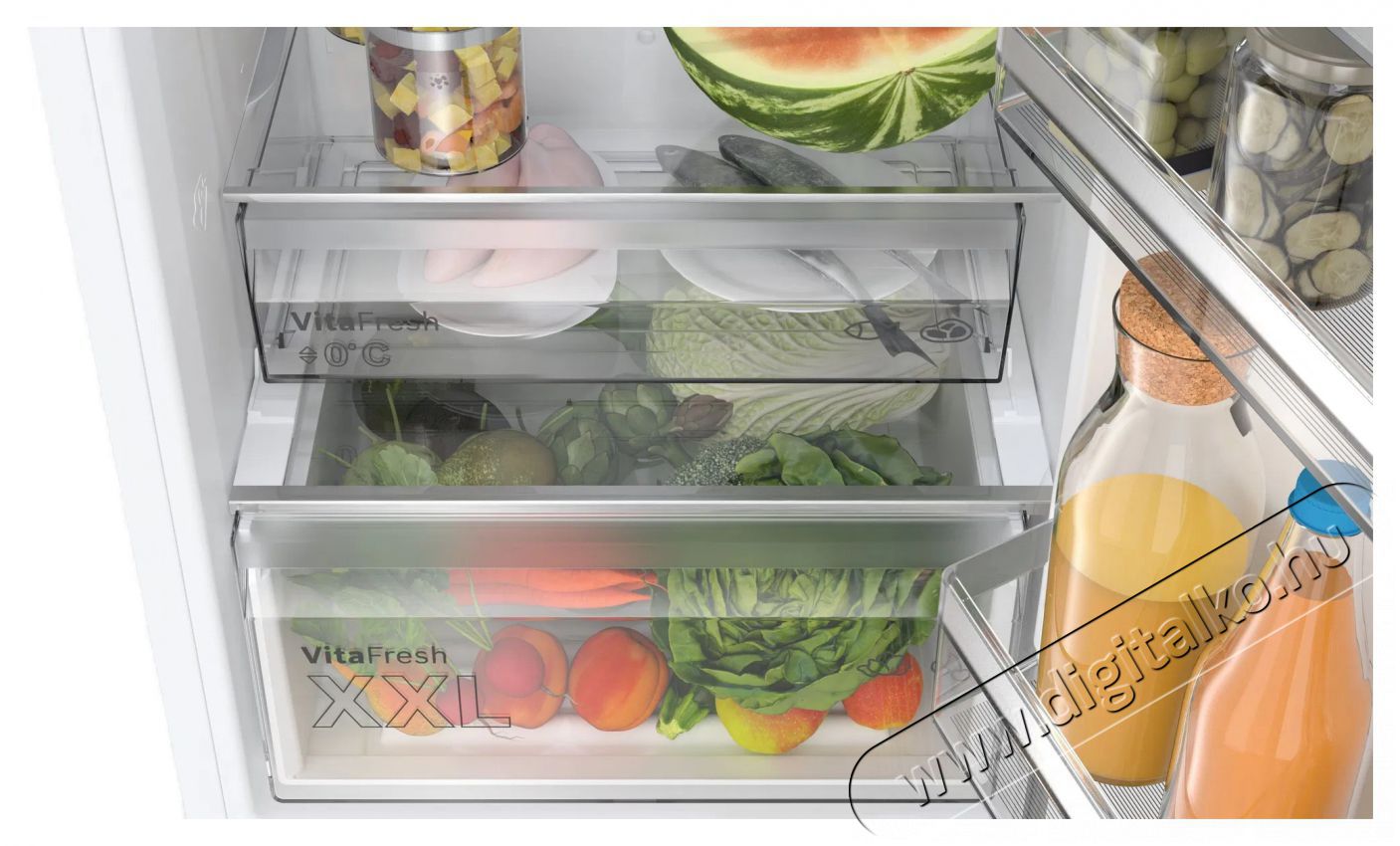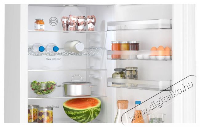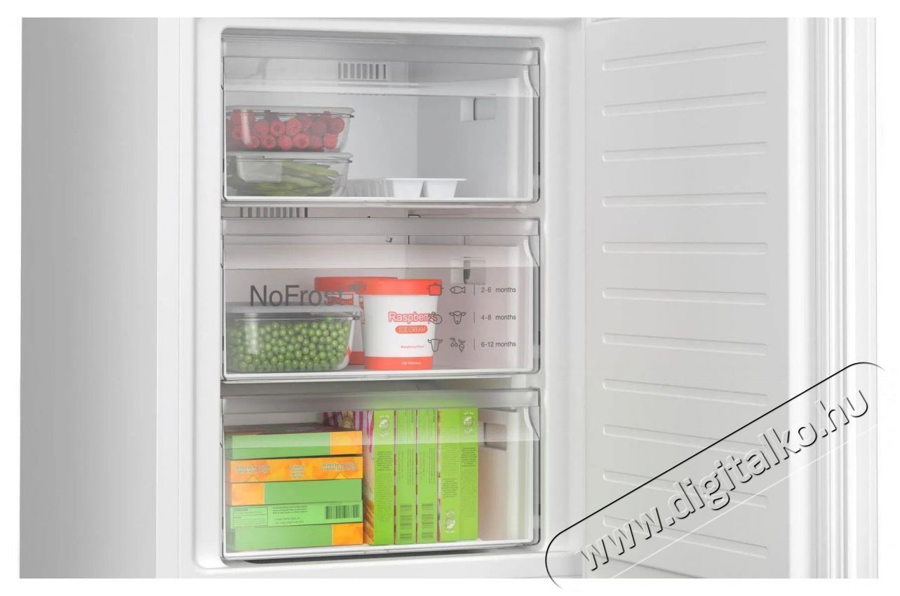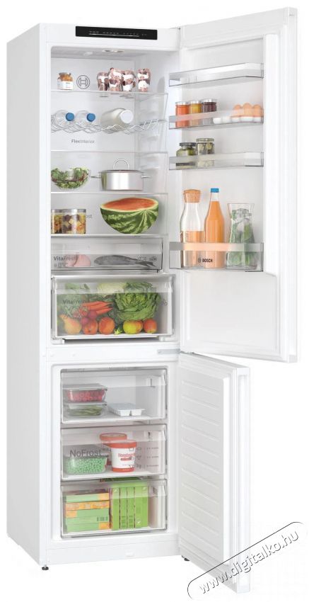 Mi mással örvendeztet még meg a minőségi Bosch hűtőszekrény?A szuper BOSCH KGN392WDF Serie 4 Hűtőszekrény Total No Frost rendszerrel is fel lett szerelve, amely fellép a jegesedés ellen, ezáltal energiát spórolhatsz. Amikor újabb élelmiszereket helyezel bele, a fagyasztós hűtő rövid időre gyorsan csökkenti a hőmérsékletet, hogy gyorsan és rendesen mindent lehűtsön. A Zero zone egy speciális rekesz, ahol a hőmérséklet épp csak 0 fok felett van. Garantálja ezáltal az optimális feltételeket az ételek aromájának és színének megőrzésére, ennek köszönhetően egészen addig ízletes és tetszetős marad minden, amíg el nem fogyasztod. Kettős hűtőrendszert kapott, külön a hűtőhöz és a mélyhűtőhöz. Belül elegendő és gazdaságos LED-fénnyel rendelkezik. A beállítások és működés ellenőrzése az egyszerűsített, egyértelmű kijelzőn történik. Ha nyitva felejted a hűtőajtót, a készülék jelezni fog. A belső tér egyenletes hideglevegő-eloszlással rendelkezik a Multi-Air Flow funkciónak hála.