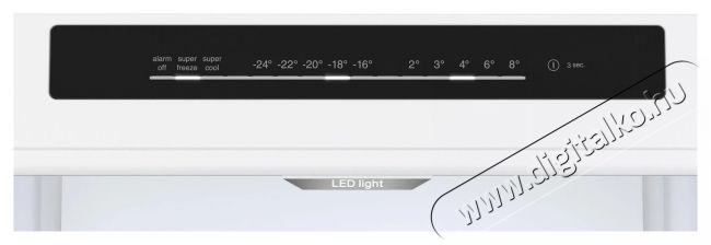 | Hűtőszekrény tulajdonságai | 90°-os ajtónyitás, Kijelző, LED világítás, Nyitott hűtőajtó jelzés |