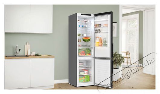 BOSCH hűtőszekrény modern és gazdaságos LED-világítássalA belső LED-világítás egyenletes és káprázásmentes megvilágítást biztosít a BOSCH KGN39VXCT Serie 4 hűtőszekrény teljes belső terében. A modern LED-technológiának köszönhetően csökken az energiafogyasztás, és nincs hőmérséklet-emelkedés, mint a hagyományos halogén izzók esetében. A világítás a BOSCH kombinált hűtőszekrény teljes élettartama alatt tartósan használható.