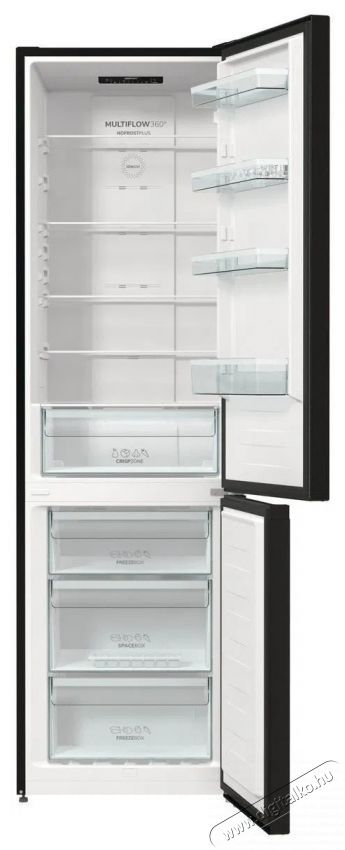 A GORENJE NRK6202EBXL4 hűtő-fagyasztó készülék MultiFlow360° szellőztető rendszerrel van felszerelve, amely egyenletes levegőelosztást biztosít a hűtőszekrény belsejében. A levegő 14 szellőzőnyíláson keresztül áramlik. Ez biztosítja, hogy minden polcon ideális klíma uralkodjon, így az élelmiszerek hosszabb ideig maradnak frissek. Ehhez hozzájárul a fejlett ionizációs technológia is. A készülék által generált negatív töltésű ionok folyamatosan megújítják a levegőt, hogy utánozzák a természetes mikroklímát.