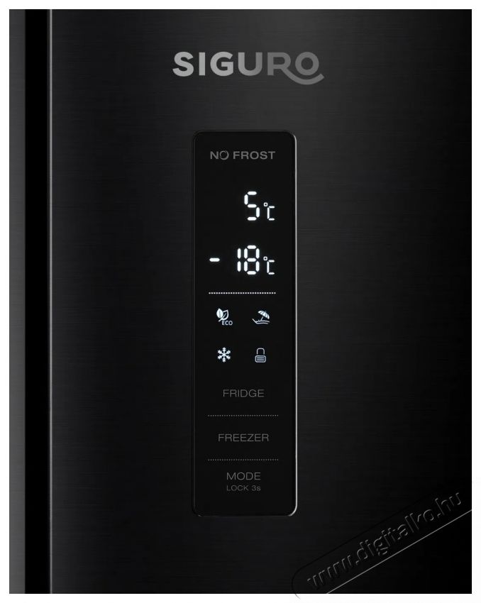 A hőmérséklet szabályozását az ajtón található áttekinthető érintőpanel biztosítja, amely lehetővé teszi a hűtő (2-8 °C) és a fagyasztó (-22 és -14 °C között) részek hőmérsékletének független beállítását. A panel 25 másodperc inaktivitás után és az összes ajtó bezárásakor automatikusan lezár. A feloldáshoz tartsd nyomva a MODE gombot 3 másodpercig. Rendelkezésre áll gyerekzár is, amely megakadályozza a beállítások véletlen módosítását. A Siguro LunoraE252Y hűtőszekrény riasztóval is fel van szerelve – ha az ajtót 90 másodpercnél hosszabb ideig nyitva hagyod, hangjelzés szólal meg, amely addig ismétlődik, amíg be nem zárod.