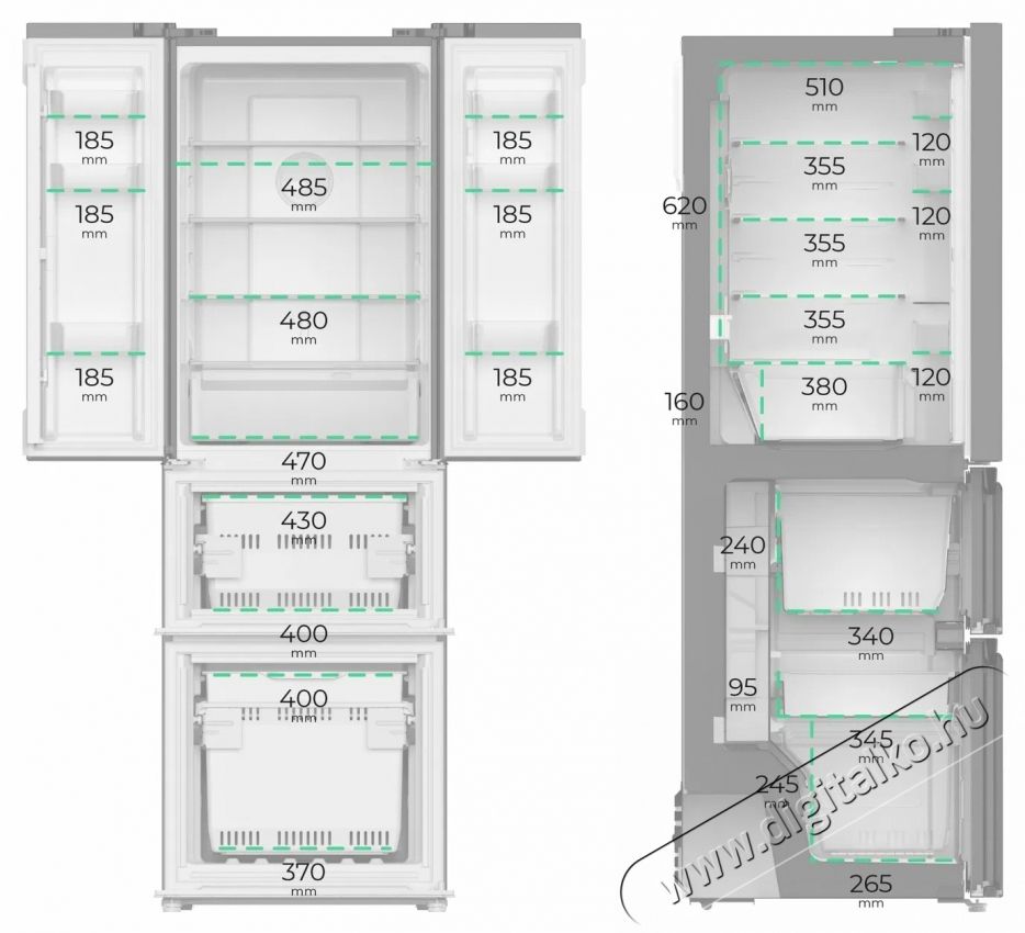 Ez a modern francia hűtőszekrény 320 literes össztérfogatával ötvözi az időtlen megjelenést és a praktikus elrendezést. A felső részt két széles ajtó alkotja, 191 literes hűtőtérrel, míg az alsó kihúzható fiókok további 129 litert kínálnak fagyasztott élelmiszerek számára. A No Frost rendszernek és a Multi-AirFlow egyenletes légáramlásnak köszönhetően nem képződik jég, és az élelmiszerek hosszabb ideig frissek maradnak. ASiguro Lunora E252Y hűtőszekrény vezérlését érintőképernyős LED panel biztosítja, amely olyan funkciókat tesz elérhetővé, mint a gyorsfagyasztás, a gyerekzár vagy az energiatakarékos és a nyaralás üzemmód. Az elegáns rozsdamentes kivitel integrált fogantyúkkal, a csendes kompresszor és az E energiaosztály teszik ezt a hűtőszekrényt a modern otthon stílusos és megbízható kiegészítőjévé.