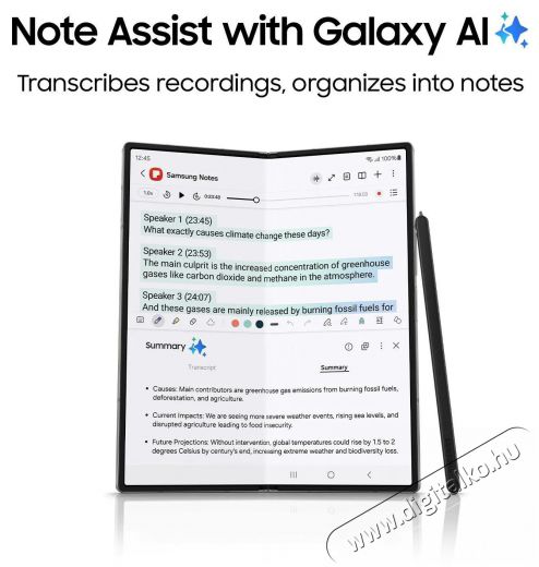 A Jegyzetsegéd funkció gondoskodik a tökéletes prezentációkról. Átírja a hangfelvételt, és szervezett jegyzetekké alakítja át. Ez megkönnyíti, hogy minden kulcsfontosságú dologról világos összefoglalót kapj. Az okos S Pen támogatás azonban lehetővé teszi, hogy kényelmesen jegyzetelhess kézzel, emellett rajzolhass és vázolhass bármit, amire szükséged van a Samsung Galaxy Z Fold6 nagyméretű fő kijelzőjén.