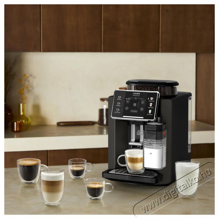 A KRUPS EA912910 Sensation Milk Pepite kávéfőző 6 egyedi kávé- és tejes ital elkészítésében segít. A frissen őrölt kávészemek garantálják a tökéletes ízt, akárcsak a kedvenc kávézódban.
