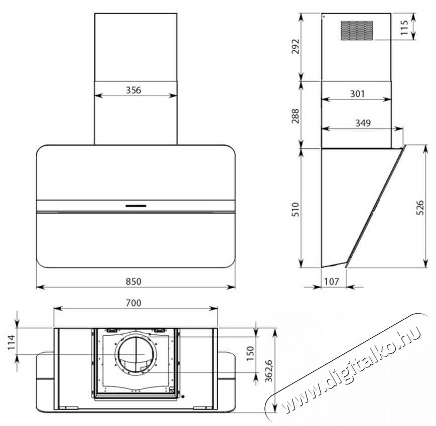 | Tulajdonságok | elektronikus vezérlés, LED világítás, kivehető és mosható fém zsírfilter, opcionális kombinált regenerálható Carbon.Zeo szűrő, aktívszén-filter a csomagolásban, falra szerelhető hátfal, opcionális kürtő, fekete edzett üveg közepén ujjlenyomatmentes sáv |