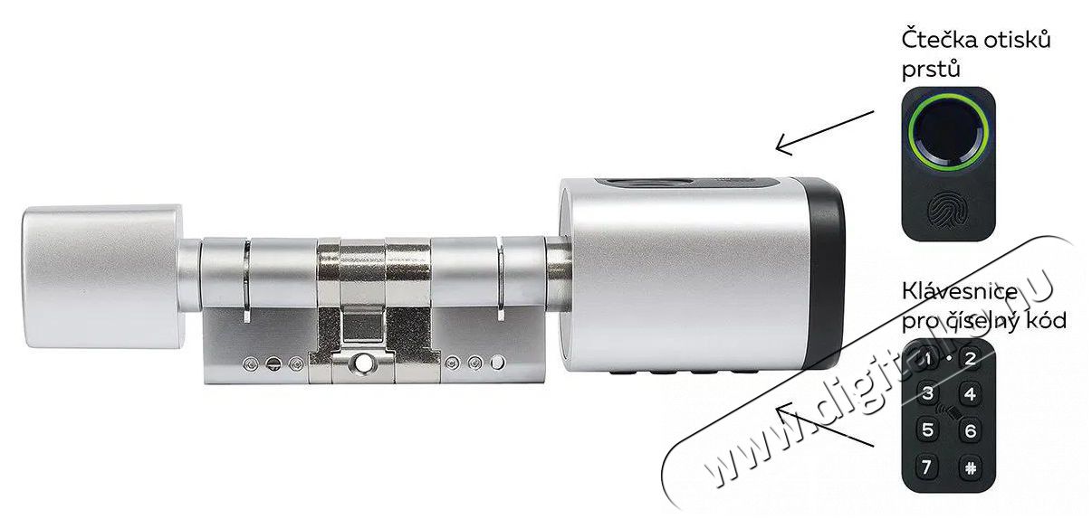 Cilinderbetét - gombos, mérete 35/40, hagyományos, egyoldalas, smart, hozzáférés megosztása, bluetooth feloldás és monitoring, ellenálló korrózió és széttörés ellen, biztonsági kártyával, Android és iOS támogatás, Tuya kompatibilis, alkalmazás cseh, angol nyelven, WiFi 2,4 GHz és Bluetooth csatlakozás, tápellátás módja elemes