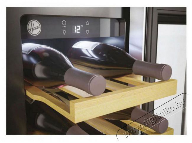 A HOOVER HWCB 30/1 H-WINE 300 borhűtő hat darab fa polca hatékonyan osztja fel a belső teret, és hozzájárul a készülék csendes működéséhez – így a borok nyugodt, stabil környezetben tárolhatók.