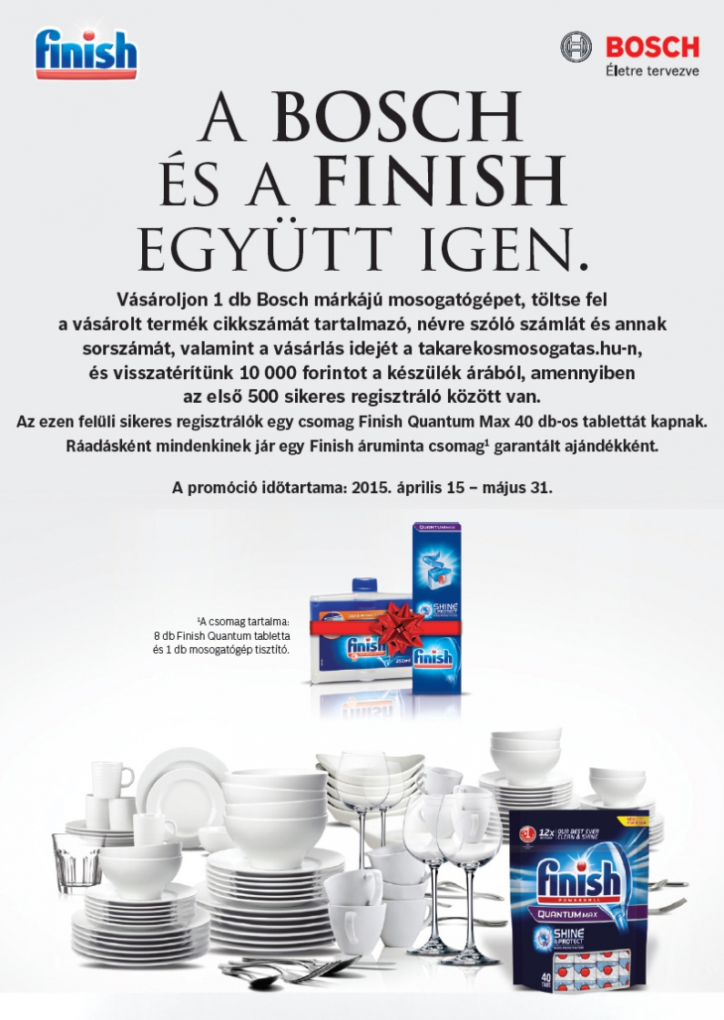 Vásároljon 1 db Bosch márkájú mosogatógépet 2015. május 31-ig és egy Finish áruminta csomagot kap hozzá ajándékba!