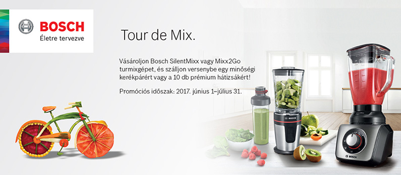 Vásároljon Bosch SilentMixx vagy Mixx2Go turmixgépet 2017. június 1. és 2017. július 31. között, és szálljon versenybe egy minőségi kerékpárért vagy a 10 db prémium hátizsák egyikéért!
