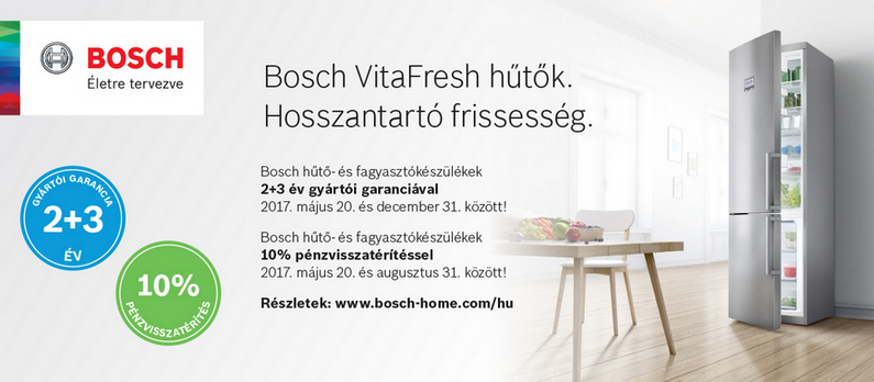 Bosch hűtő- és fagyasztókészülékek 10% pénzvisszatérítéssel 2017. május 20. és augusztus 31. között!