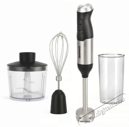 Daewoo DHB60BX botmixerA Daewoo 3 az 1-ben készlet leegyszerűsíti a konyhai munkát, lehetővé téve az aprítást, keverést, valamint krémek vagy smoothie-k készítését egyetlen erős és ergonomikus motor segítségével. A három cserélhető fej és a mérőpohár maximális sokoldalúságot és helytakarékosságot biztosít, így komplett megoldást nyújt bármely gyors recepthez.