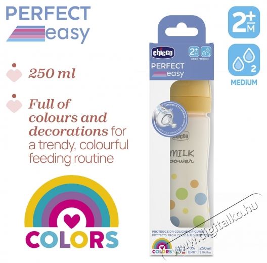 A Chicco PERFECT EASY 250 ml-es műanyag cumisüveg maximális praktikusságot biztosít ergonomikus formájának köszönhetően, alkalmas sterilizálásra és mosogatógépben is mosható.