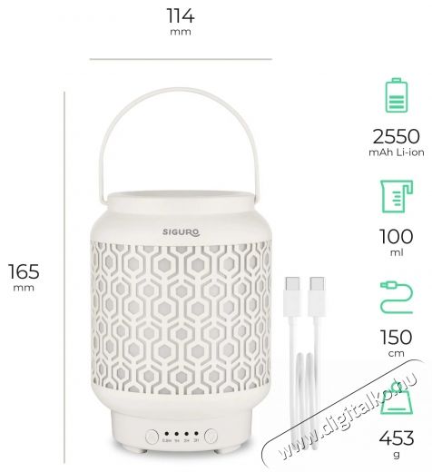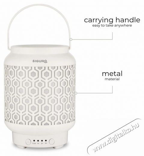 Az aroma diffúzor néhány perc alatt illatosítja és párásítja a levegőt a gyerekszobában, hálószobában vagy bármely más helyiségben. A finom pára révén aktív anyagokat bocsát a levegőbe, amelyek belélegzése pozitív hatással van a szervezetre. A 100 ml-es tartály akár 4-5 órányi folyamatos működéshez is elegendő. Természetesen rendelkezik automatikus kikapcsolás funkcióval arra az esetre, ha a tartályból elfogyna a víz. A Siguro Mist Lantern N350W aroma diffúzor ráadásul háromféle üzemmódú háttérvilágítással is rendelkezik, amely tökéletes hangulatot teremt a relaxációhoz és pihenéshez.