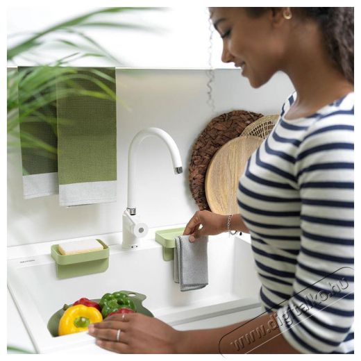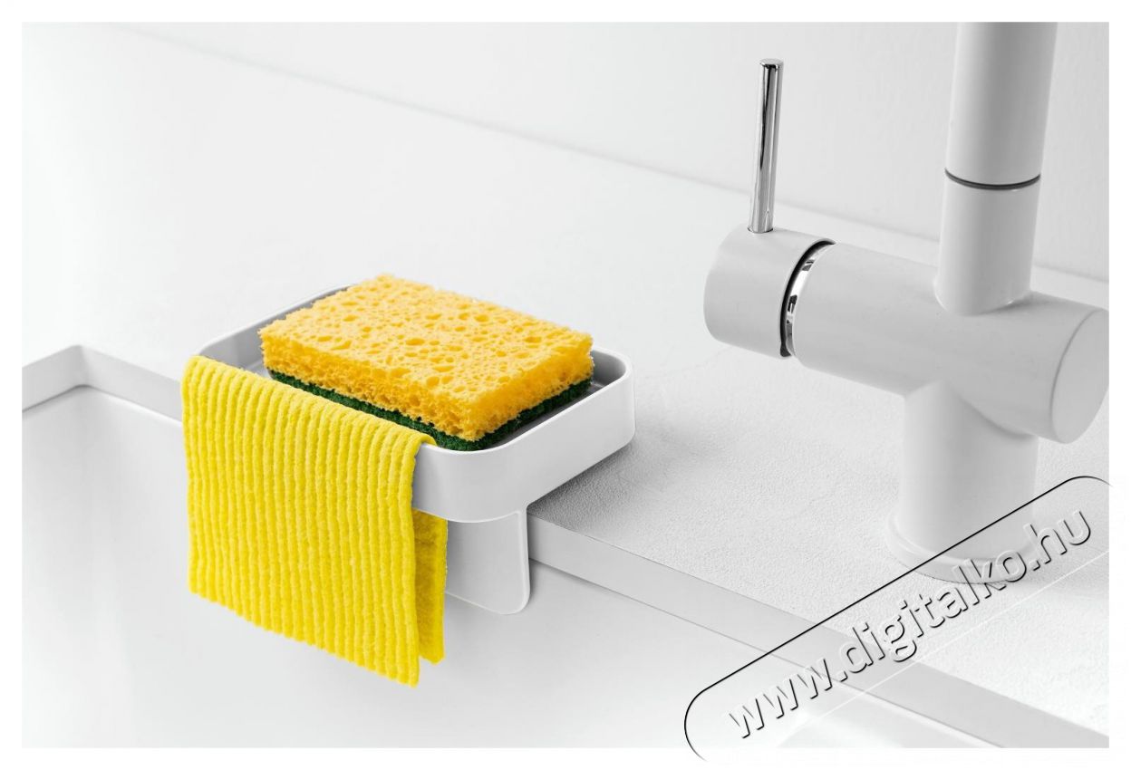 Praktikus és higiénikus tartó konyhai mosogatók mellé. Tapadókorongokkal egyszerűen rögzíthető a mosogató falára, így a szivacs, kendő vagy kefe mindig kéznél van, mégis rendben marad a mosogató környezete. Beépített csepegtető tálcája lefolyóval biztosítja, hogy a víz ne álljon meg a szivacs alatt, a kis rúd pedig ideális törlőkendők vagy rongyok felakasztásához.