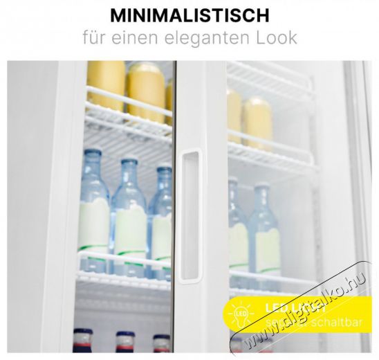 Élvezze az abszolút biztonságot ennek a nagy hűtőszekrénynek a zárható és dupla üvegezésű ajtajával - tökéletes családok, kioszkok vagy rendezvények számáraTiszta rugalmasság az italhűtő 6 állítható polcával, amelyek mindegyike akár 30 kg súlyt is képes elbírni, minden igényhez megfelelő. Tapasztalja meg a korlátlan tárolási lehetőségeket a 347 literes hasznos térfogattal és a LED-es belső világítással, amely minden italt megfelelő megvilágításba helyez. Tökéletesség a részletekben fokozatmentes hőmérséklet-szabályozással 0°C ~ +10°C között, állítható lábakkal és jobb oldali ajtópánttal minden helyiséghez. A friss levegő keringését az italhűtőbe épített, fagyasztórekesz nélküli keringető ventilátor garantálja, így minden ital mindig tökéletesen hűtőt.