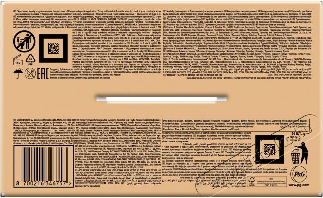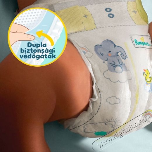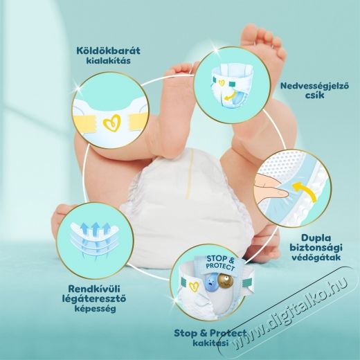 | Tulajdonságok | Ergonómikus abszorbens mag, Extra légáteresztő, Nedvességfelszívó csatornák, Nedvességjelző, Pelenkakiütés elleni védelem, Rugalmas szalag |