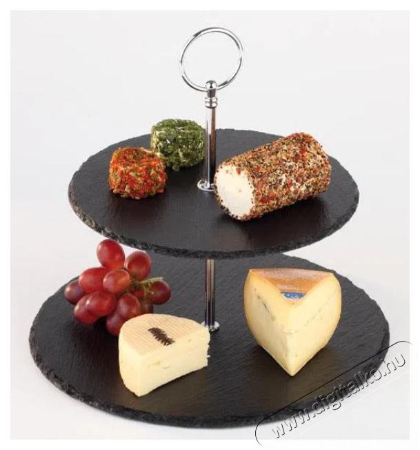 Kétszintes tortaállvány sütemények, mini szendvicsek, desszertek, édességek és egyéb finomságok számára - remek választás vendéglátóegységekben, üzletekben vagy szállodákban, valamint otthon történő használatra. A 25 és 20 cm átmérőjű, agyagpalából készült tálcával rendelkező Az APS 00989 kínáló stílusos és elegáns, valamint rozsdamentes acél fogantyúval rendelkezik a könnyű kezelés és hordozás érdekében. A mutatós kínáló könnyen össze- és szétnyitható, és helyet takarítasz meg az asztalon.