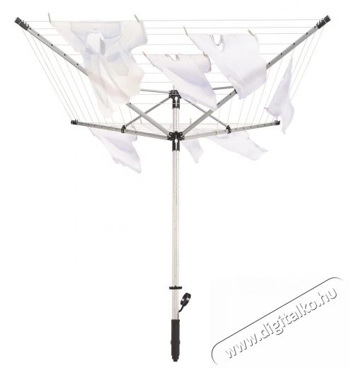 A ruhaszárító hasznos funkciói kényelmesebbé teszik a használatát. Forgatható karokkal van felszerelve, ami jól jön a ruhák kiteregetésekor, mert nem kell folyton a szárító körül rohangálni, még akkor sem, ha az tele van nedves ruhákkal. Nagyszerű bónusz a vállfák számára kialakított hely, így az ingek vagy pólók szárítása is könnyen megoldható. Nem kell aggódnod a telepítéssel kapcsolatban sem, csak bele kell szúrni a földbe.