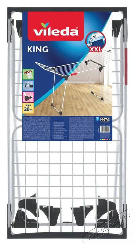VILEDA King 20 m A ruhaszárító szinte minden háztartásban nélkülözhetetlen eszköz. A Vileda King szárítója nagyvonalú, 20 m-es szárítási területet biztosít, így könnyedén felakaszthatsz 2 teljes mosógépnyi szennyest. Az acéllábak garantálják a Vileda King szárító nagy stabilitását, a praktikus görgők pedig kényelmes kezelhetőséget biztosítanak a könnyű áthelyezéshez. Az erősalumíniumhuzaloknak köszönhetően a szennyes kevésbé gyűrődik, a vasalási idő pedig csökken. A Vileda King ruhaszárító praktikus szárnyzárral van ellátva a kényelmes tárolás érdekében. Van egy praktikus tartó is a kisebb tárgyak számára, amely ideális például zoknik vagy alsóneműk szárítására.