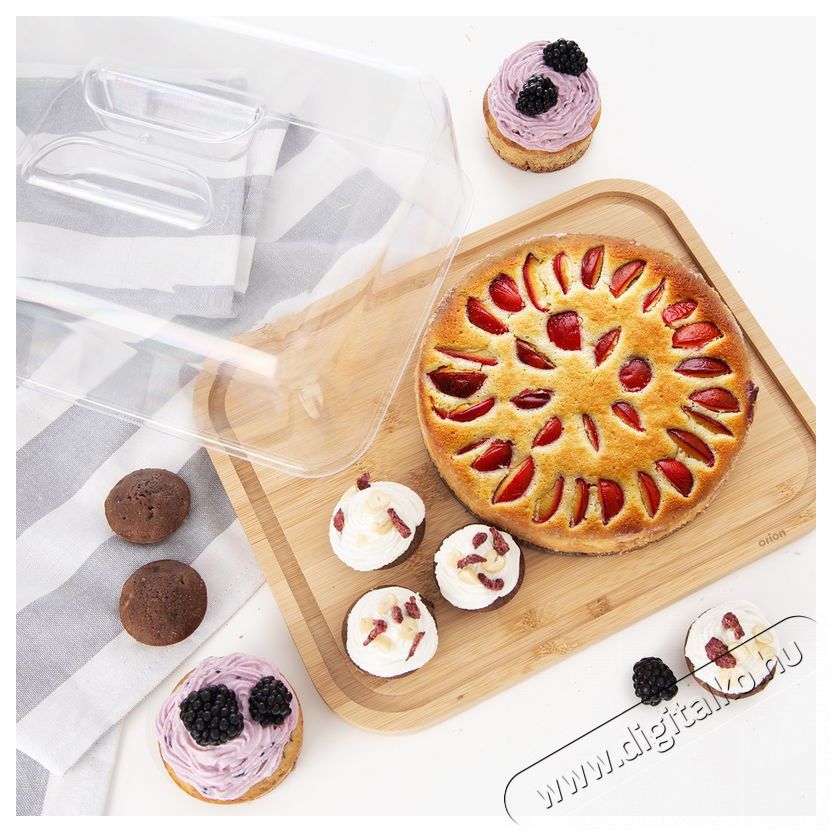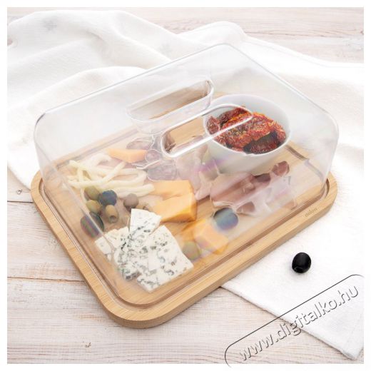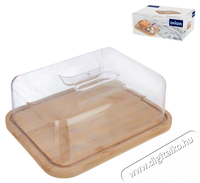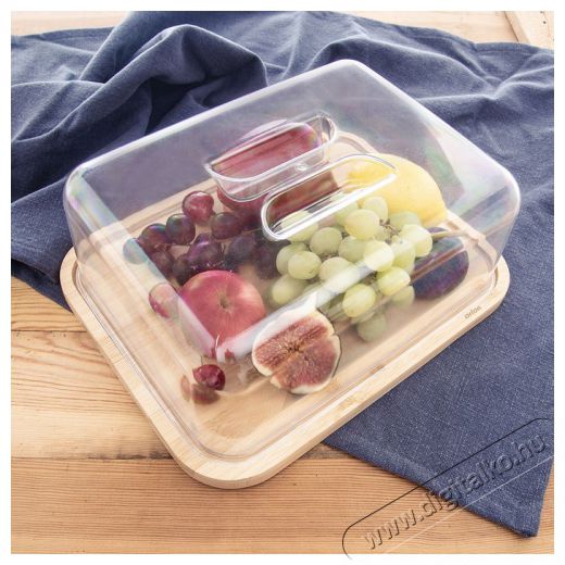 Orion Bambusz vágódeszka-tálaló fedéllel, 28×22×11 cm Az elegáns, fedeles tálalódeszka praktikus kiegészítő minden háztartásba és kültéri ülősarokba. A bambusz deszka hornyval kiválóan alkalmas édes és sós finomságok tálalására, míg a átlátszó műanyag fedél megvédi azokat a kiszáradástól és a nem kívánt rovaroktól. Alakjának és kivitelének köszönhetően mindennapi használatra és ünnepi alkalmakra egyaránt alkalmas.