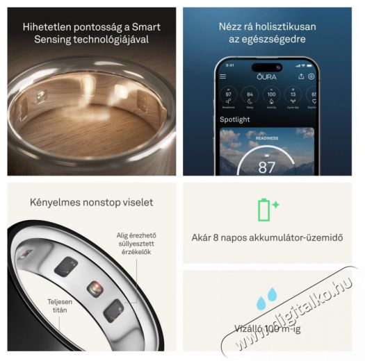 Ellenálló titán a mindennapi viseléshez Az Oura Ring 4 okosgyűrű kiváló minőségű titánból készült, ami könnyebb, mint egy hagyományos karikagyűrű, hipoallergén, és úgy tervezték, hogy hosszú éveken át bírja a használatot. Az okosgyűrű akár 100 méteres mélységig vízálló, ellenáll a szélsőséges körülményeknek – legyen szó szaunáról vagy jeges fürdőről, és strapabíróságának köszönhetően még a legmozgalmasabb életstílus mellett is megbízható társad marad. Ez egy olyan kiegészítő, ami nem csak stílusos, hanem a komoly terhelést is kibírja. A beépített érzékelők emellett kényelmes viselést biztosítanak anélkül, hogy bármilyen zavaró tényezőt jelentenének a mindennapok folyamán vagy alvás közben.