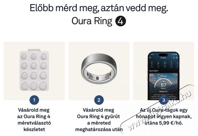 Tudd meg a megfelelő méretet vásárlás előtt Mielőtt megrendelnéd az Oura Ring 4 okosgyűrűt, javasoljuk, hogy először vásárold meg az Oura Sizing Kit – praktikus mérethatározó készletet. Ennek segítségével kényelmesen, otthon próbálhatod ki a különböző méreteket, és megtudhatod, melyik felel meg számodra a legjobban. Ha már tudod a méretedet, bátran megrendelheted az Oura Ring 4 okosgyűrűt.