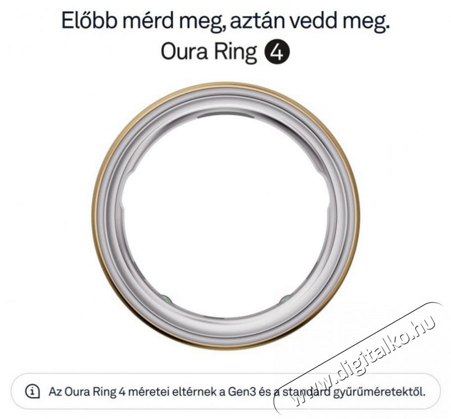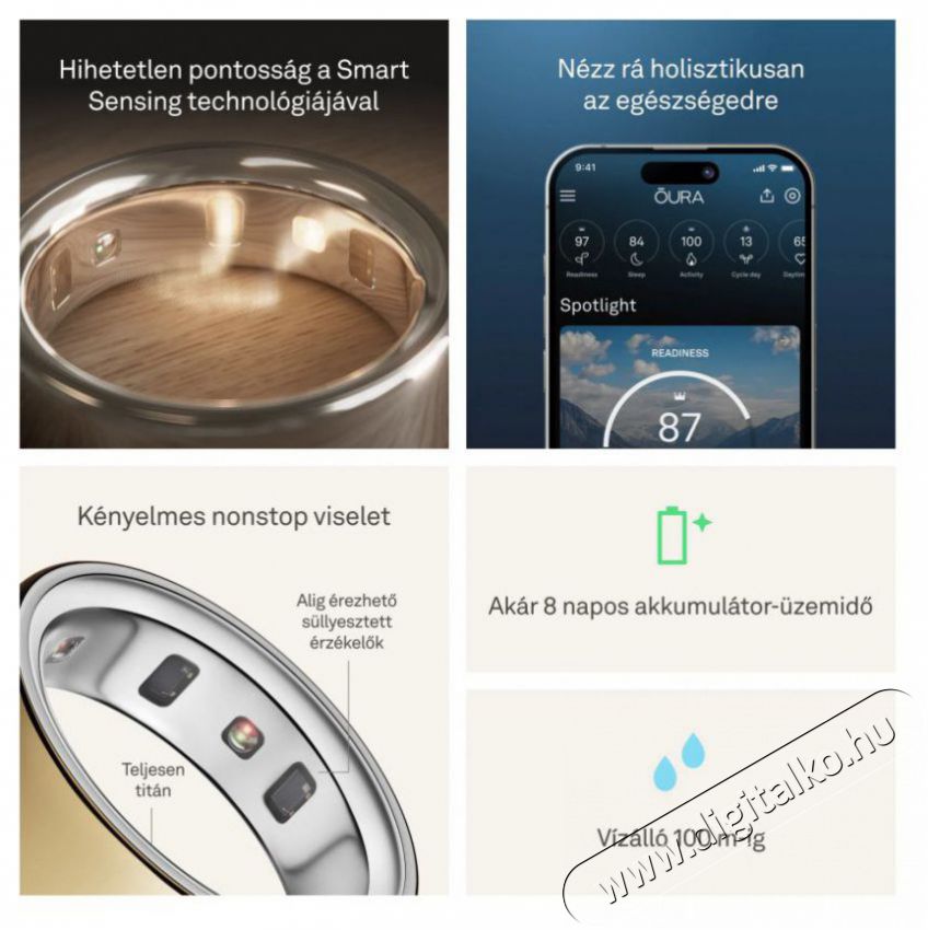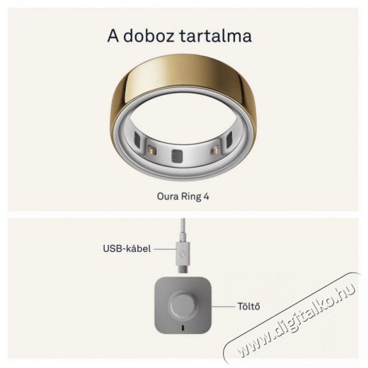 Oura Ring 4Elegáns okosgyűrű a folyamatos egészségmegőrzéshez Az Oura Ring 4 okosgyűrű forradalmasítja azt, ahogyan a saját testedhez viszonyulsz. A könnyű titánból készült, apró és elegáns gyűrű belsejében kutatási pontosságú technológia rejtőzik, amely elősegíti a jobb alvást, a hatékonyabb regenerálódást és segít megérteni, mi zajlik valójában a felszín alatt. Olyan kulcsfontosságú területeket figyelhetsz meg vele, mint az alvás, a napi aktivitás és kondíció, az általános felkészültségi szint, a szív egészsége vagy a mindennapos stressz szintje – olyan nagymértékű pontossággal, ami versenyre kel a hagyományos viselhető eszközök által nyújtott lehetőségekkel. Mindezt közvetlenül az ujjadról, ahol a biometrikus adatok a legpontosabbak. Az Oura Ring 4 okosgyűrű kiemelkedő precizitást nyújt a modern szenzoroknak köszönhetően, akár 8 napos akkumulátor-üzemidőt biztosít, 100 méterig vízálló, és több, mint 40 alkalmazással képes együttműködni. Bluetooth Low Energy kapcsolaton keresztül kommunikál, és teljesen kompatibilis Android és iOS eszközökkel is. Támogatja a metrikus és angolszász mértékegységeket, valamint több nyelvet, például az angolt, a németet és a japánt. Az Oura Ring 4 okosgyűrű viselésével minden fontos információ szó szerint karnyújtásnyira van – pontosabban az ujjadon.