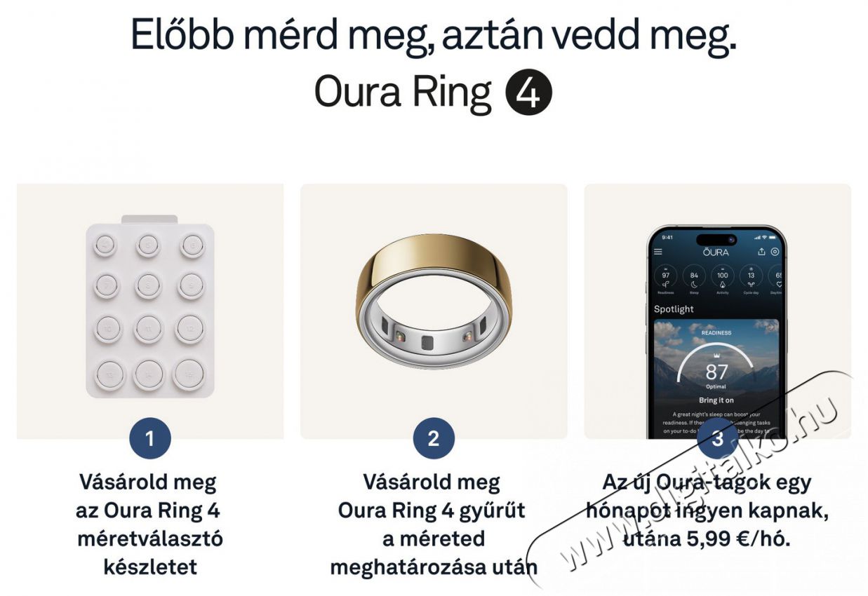 Oura Ring 4 - Elegáns okosgyűrű a folyamatos egészségmegőrzéshezAz Oura Ring 4 okosgyűrű forradalmasítja azt, ahogyan a saját testedhez viszonyulsz. A könnyű titánból készült, apró és elegáns gyűrű belsejében kutatási pontosságú technológia rejtőzik, amely elősegíti a jobb alvást, a hatékonyabb regenerálódást és segít megérteni, mi zajlik valójában a felszín alatt. Olyan kulcsfontosságú területeket figyelhetsz meg vele, mint az alvás, a napi aktivitás és kondíció, az általános felkészültségi szint, a szív egészsége vagy a mindennapos stressz szintje – olyan nagymértékű pontossággal, ami versenyre kel a hagyományos viselhető eszközök által nyújtott lehetőségekkel. Mindezt közvetlenül az ujjadról, ahol a biometrikus adatok a legpontosabbak. Az Oura Ring 4 okosgyűrű kiemelkedő precizitást nyújt a modern szenzoroknak köszönhetően, akár 8 napos akkumulátor-üzemidőt biztosít, 100 méterig vízálló, és több, mint 40 alkalmazással képes együttműködni. Bluetooth Low Energy kapcsolaton keresztül kommunikál, és teljesen kompatibilis Android és iOS eszközökkel is. Támogatja a metrikus és angolszász mértékegységeket, valamint több nyelvet, például az angolt, a németet és a japánt. Az Oura Ring 4 okosgyűrű viselésével minden fontos információ szó szerint karnyújtásnyira van – pontosabban az ujjadon.