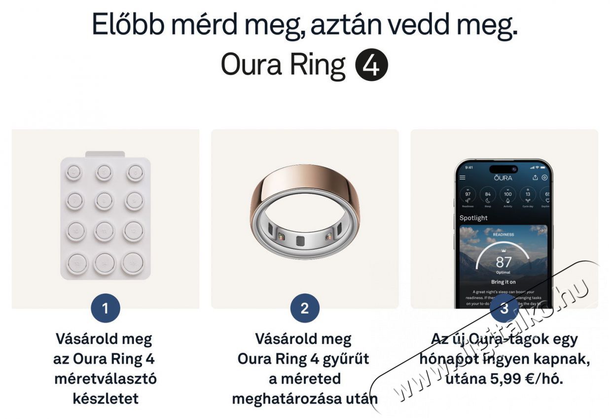 Oura Ring 4 - Elegáns okosgyűrű a folyamatos egészségmegőrzéshezAz Oura Ring 4 okosgyűrű forradalmasítja azt, ahogyan a saját testedhez viszonyulsz. A könnyű titánból készült, apró és elegáns gyűrű belsejében kutatási pontosságú technológia rejtőzik, amely elősegíti a jobb alvást, a hatékonyabb regenerálódást és segít megérteni, mi zajlik valójában a felszín alatt. Olyan kulcsfontosságú területeket figyelhetsz meg vele, mint az alvás, a napi aktivitás és kondíció, az általános felkészültségi szint, a szív egészsége vagy a mindennapos stressz szintje – olyan nagymértékű pontossággal, ami versenyre kel a hagyományos viselhető eszközök által nyújtott lehetőségekkel. Mindezt közvetlenül az ujjadról, ahol a biometrikus adatok a legpontosabbak. Az Oura Ring 4 okosgyűrű kiemelkedő precizitást nyújt a modern szenzoroknak köszönhetően, akár 8 napos akkumulátor-üzemidőt biztosít, 100 méterig vízálló, és több, mint 40 alkalmazással képes együttműködni. Bluetooth Low Energy kapcsolaton keresztül kommunikál, és teljesen kompatibilis Android és iOS eszközökkel is. Támogatja a metrikus és angolszász mértékegységeket, valamint több nyelvet, például az angolt, a németet és a japánt. Az Oura Ring 4 okosgyűrű viselésével minden fontos információ szó szerint karnyújtásnyira van – pontosabban az ujjadon.