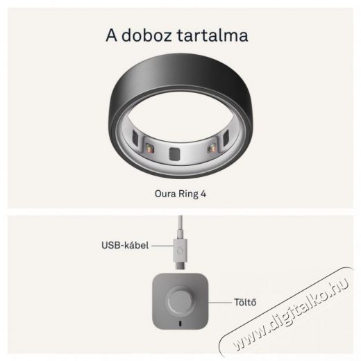 Oura Ring 4 - Elegáns okosgyűrű a folyamatos egészségmegőrzéshez Az Oura Ring 4 okosgyűrű forradalmasítja azt, ahogyan a saját testedhez viszonyulsz. A könnyű titánból készült, apró és elegáns gyűrű belsejében kutatási pontosságú technológia rejtőzik, amely elősegíti a jobb alvást, a hatékonyabb regenerálódást és segít megérteni, mi zajlik valójában a felszín alatt. Olyan kulcsfontosságú területeket figyelhetsz meg vele, mint az alvás, a napi aktivitás és kondíció, az általános felkészültségi szint, a szív egészsége vagy a mindennapos stressz szintje – olyan nagymértékű pontossággal, ami versenyre kel a hagyományos viselhető eszközök által nyújtott lehetőségekkel. Mindezt közvetlenül az ujjadról, ahol a biometrikus adatok a legpontosabbak. Az Oura Ring 4 okosgyűrű kiemelkedő precizitást nyújt a modern szenzoroknak köszönhetően, akár 8 napos akkumulátor-üzemidőt biztosít, 100 méterig vízálló, és több, mint 40 alkalmazással képes együttműködni. Bluetooth Low Energy kapcsolaton keresztül kommunikál, és teljesen kompatibilis Android és iOS eszközökkel is. Támogatja a metrikus és angolszász mértékegységeket, valamint több nyelvet, például az angolt, a németet és a japánt. Az Oura Ring 4 okosgyűrű viselésével minden fontos információ szó szerint karnyújtásnyira van – pontosabban az ujjadon.